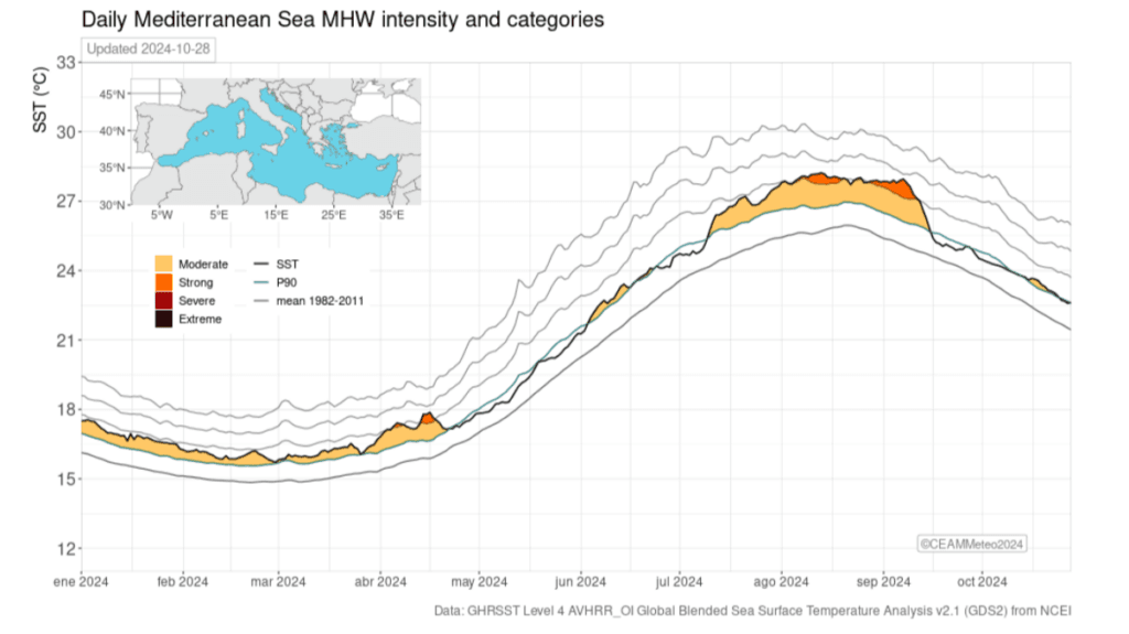 The Mediterranean Sea is one of the most affected areas by MHWs, as it has experienced significant sea warming over the last decades. Both, the SST increase due to long-term anthropogenic change and the consequent increased MHW frequency have been having devastating effects on local ecosystems.