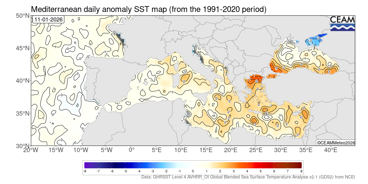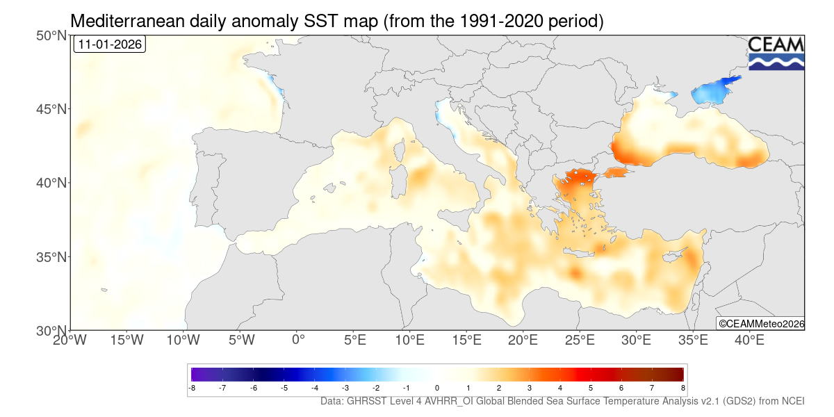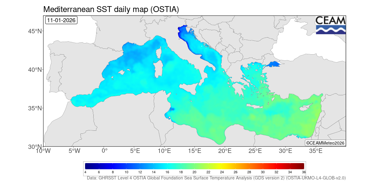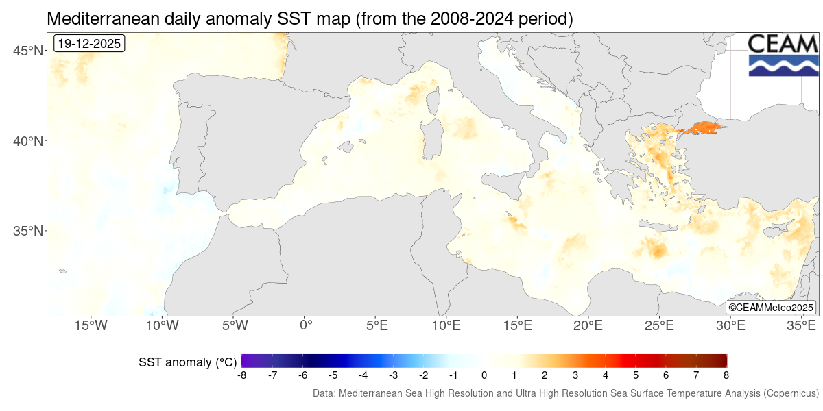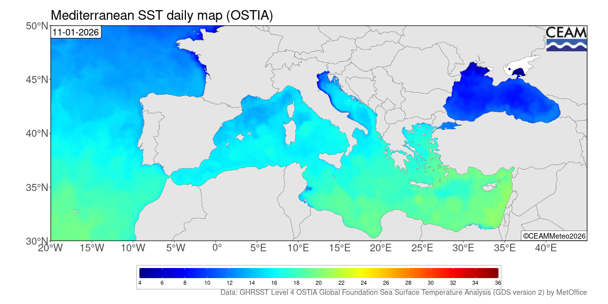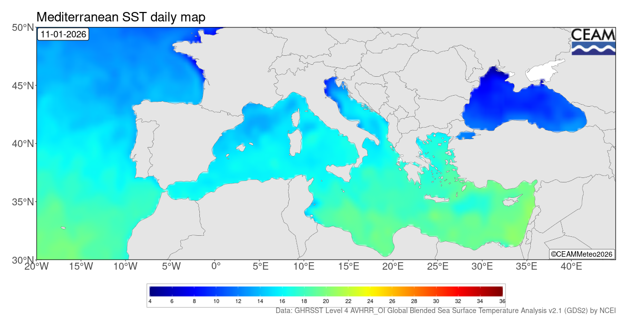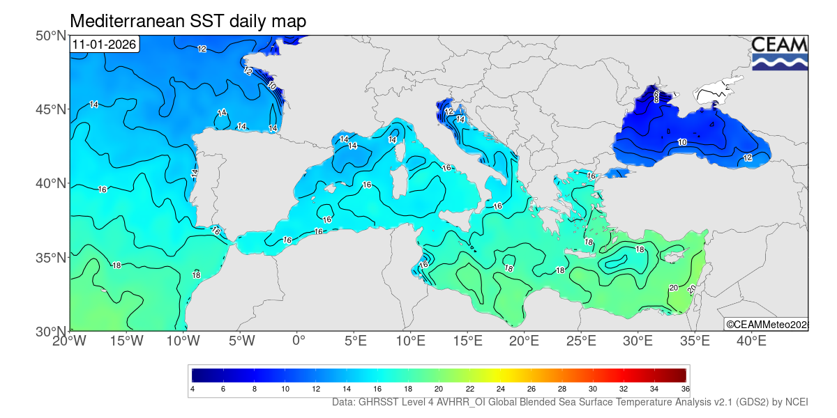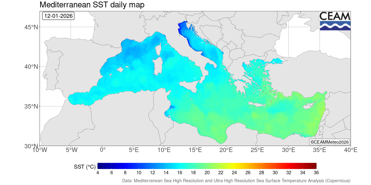 Mediterranean latest daily SST values. Generated using E.U. Copernicus Marine Service Information: Mediterranean Sea High Resolution and Ultra High Resolution Sea Surface Temperature Analysis (https://doi.org/10.48670/moi-00172)