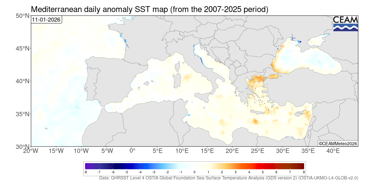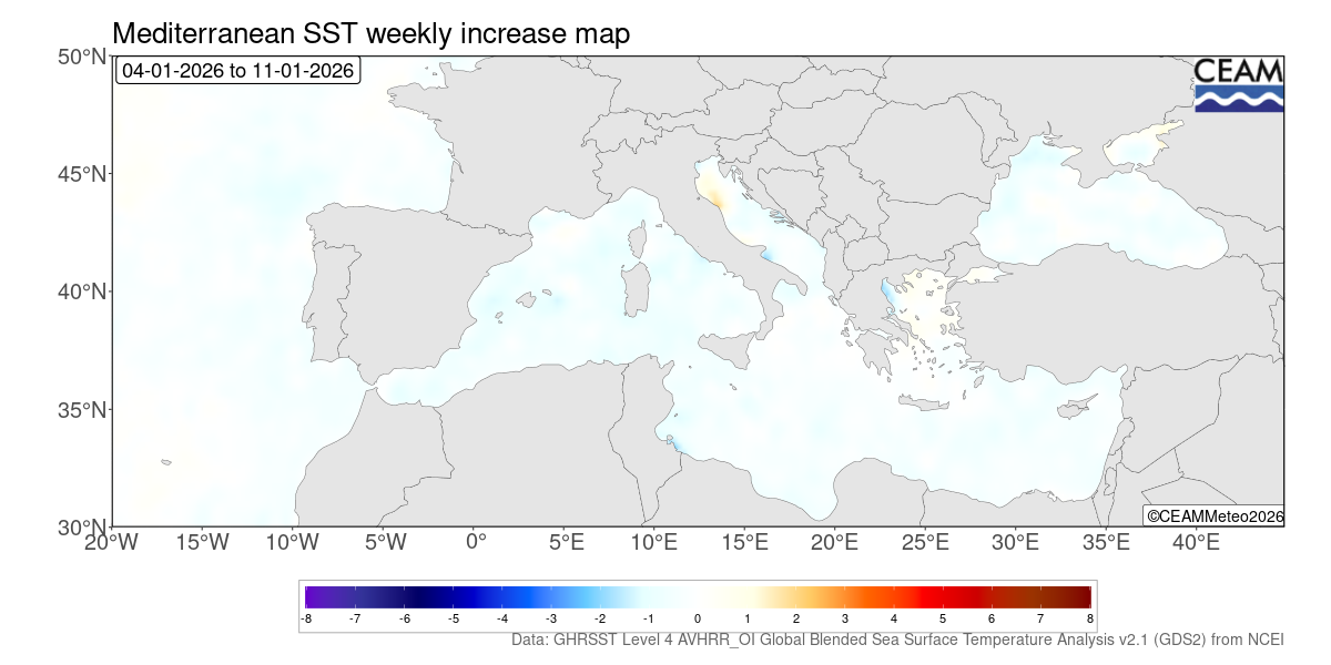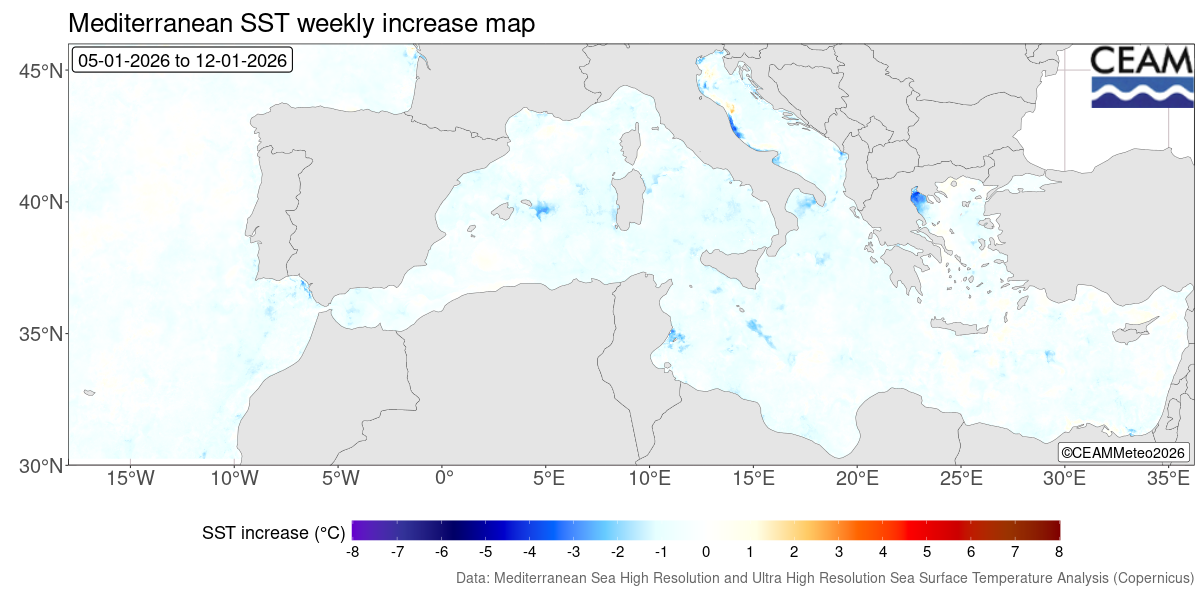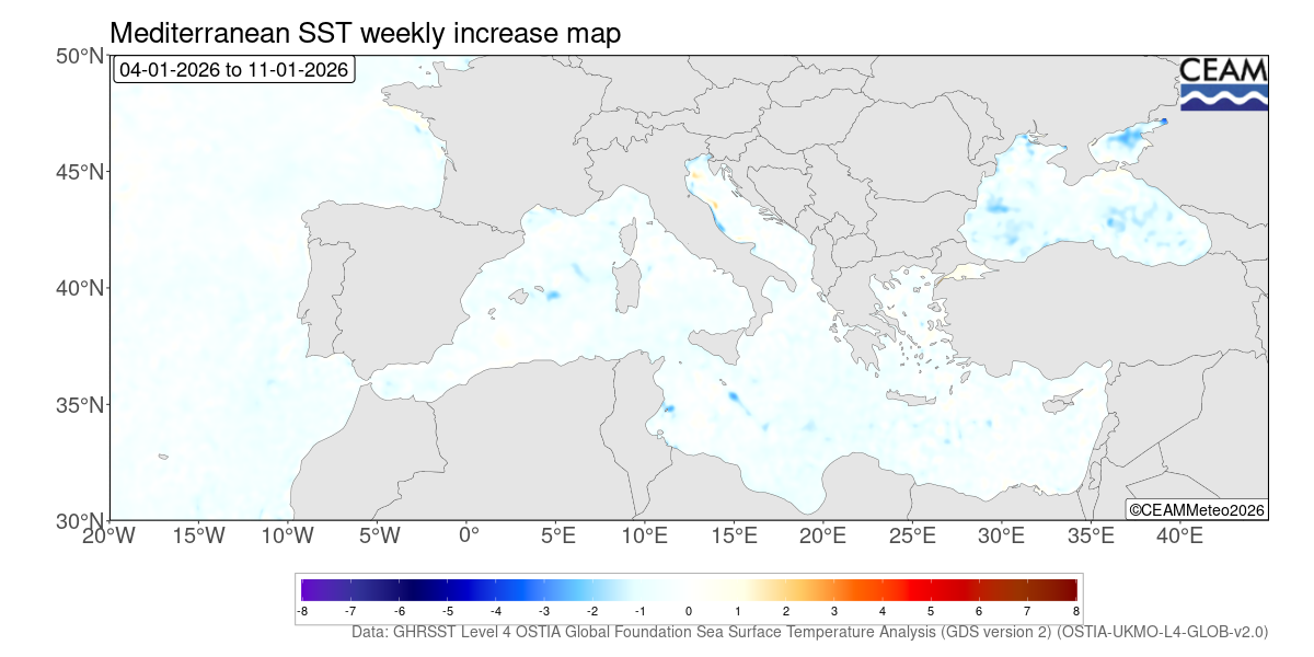 Mediterranean and Atlantic weekly SST variation. Generated using E.U. Copernicus Marine Service Information: Mediterranean Sea High Resolution and Ultra High Resolution Sea Surface Temperature Analysis (https://doi.org/10.48670/moi-00172)